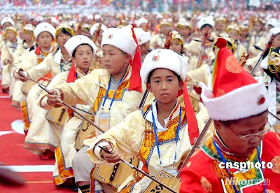Local residents play matouqin, a Mongolian stringed instrument with a horse’s head carved at the end of the neck, at the launching ceremony of the Songyuan leg of the Olympic torch relay in Jilin Province, July 15, 2008. [chinanews.com.cn]