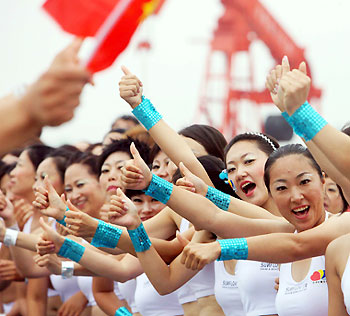Dancers give their thumb-ups during the Olympic torch relay in Songyuan, Jilin Province, July 15, 2008. [Xinhua]