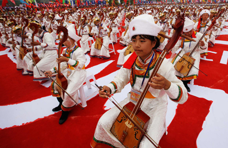 A total of 2,008 local performers play the matouqin, a Mongolian stringed instrument with a horse's head carved at the end of the neck, at the opening ceremony of the Songyuan leg of the Olympic torch relay in Jilin Province, July 15, 2008. [Xinhua]