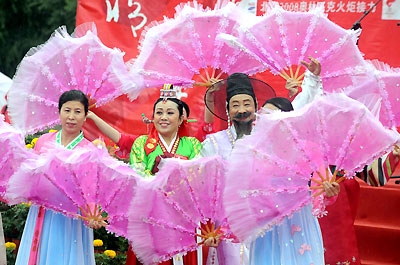 Fifty-three of yesterday's 188 torchbearers were ethnic Koreans. One of them, Jin Guangzhen, a national model policeman, ran the opening leg from Yanbian University, while former world chess champion Xie Jun ran the final leg and lit the cauldron to mark the end of the relay in Jinlin.