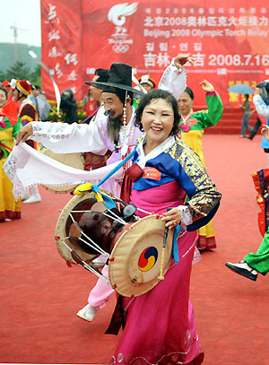 Drummers in Korean dress perform at the Olympic torch relay marking the start of the Yanji leg of the Olympic torch relay in Yanji, Jilin Province, July 16, 2008. [Xinhua]