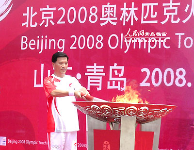 As the last torchbearer, the mayor of Qingdao Xia Geng, lights the cauldron July 21, 2008. The Qingdao leg of Olympic torch relay in Shandong Province was held on Monday. [people.com.cn]