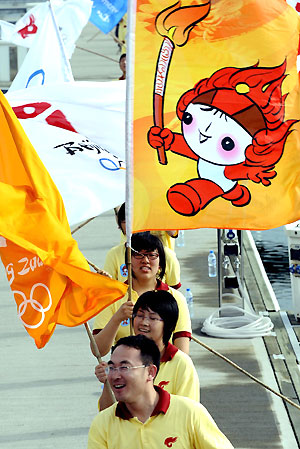 Residents wave Olympic flags to welcome the torch at the Qingdao Olympic Sailing Center. The Olympic torch relay started its tour in Qingdao, Shandong Province on July 21,2008. [Xinhua]