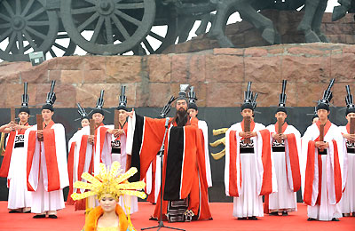 Performers in traditional dress honor Confucius with a ritual at the Olympic torch relay opening ceremony in Qufu, the sage’s hometown, in Shandong province July 22, 2008. [Xinhua]
