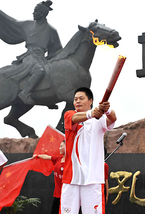 The final Qufu torchbearer Gong Zhihua, a hero from the Sichuan quake, holds the torch before a statue of Confucius to show his respect for the sage during the Olympic torch relay July 22, 2008. [Xinhua]