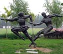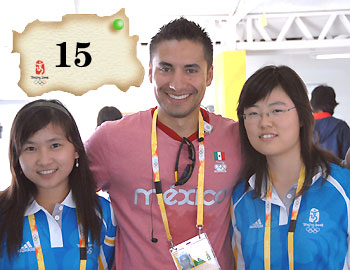 Torchbearer Zhu Anting (L), a Qufu government official, poses with Li Ting from CCTV. The Qufu leg of the Olympic torch relay kicked off July 22, 2008. [Xinhua]