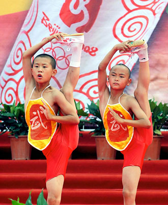 Children perform Shaolin Kung Fu at the starting ceremony of the Beijing Olympic torch relay in Zhengzhou, Henan Province, July 25, 2008. [Xinhua]