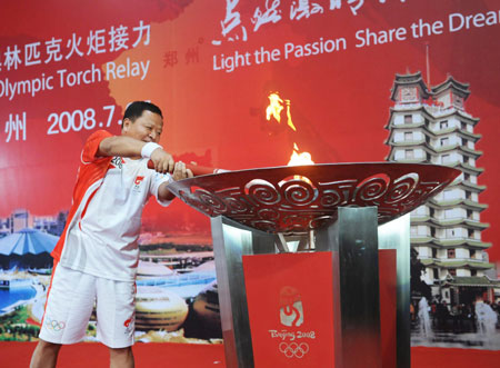 Torchbearer Wu Jiangxing lights the cauldron during the Beijing Olympic torch relay in Zhengzhou, Henan Province, July 25, 2008. [Xinhua]