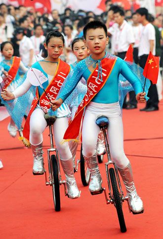 Children perform on the unicycles during the Beijing Olympic torch relay in Zhengzhou, Henan Province, July 25, 2008. [Xinhua]