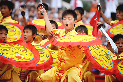 Kung fu students perform with swords and shields at the opening ceremony of the Olympic torch relay in Anyang, Henan province on July 28, 2008. [Xinhua]