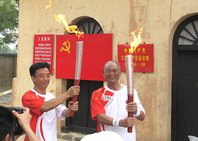 Wu Xianguo(L), the mayor of Sijiazhuang, poses with Zhao Weizhong, a retired military general, in front of the site of the Second Plenary Session of the Seventh Central Committee of the Communist Party of China. The Olympic torch relay began in Xibaipo, a small village 95 km northwest of Shijiangzhuang, Hebei province, on July 29, 2008. [Xinhua]