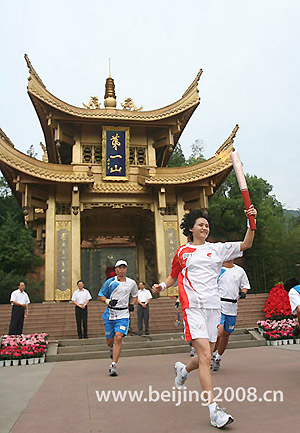 Torchbearer Gao Min holds the torch during her leg of Olympic torch relay in Leshan, Sichuan province August 4, 2008.[Xinhua]