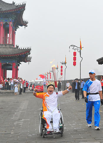 Wu Yaming carries the Paralympic torch on Friday along the city wall in Xi'an, capital of Shaanxi province. [Xinhua]