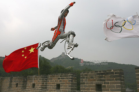 A student from Tagou Martial Arts School from Henan province jumps with a pair of spring-loaded stilts during a photo opportunity on the Badaling section of the Great Wall on the outskirts of Beijing, August 20, 2008. [Agencies]
