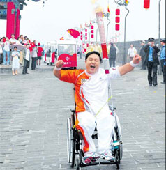 Wu Yaming carries the Paralympic torch on Friday along the city wall in Xi'an, capital of Shaanxi province. Xinhua