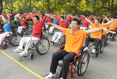 Local residents perform gymnastics routines on wheelchairs during the Beijing Paralympic torch relay in Nanjing, Jiangsu Province, September 2, 2008. [Xinhua]
