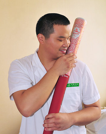 A visually-impaired doctor at Nanjing Disabled Recovery Center soaks up the Paralympic gala atmosphere by touching the torch.[Xinhua]