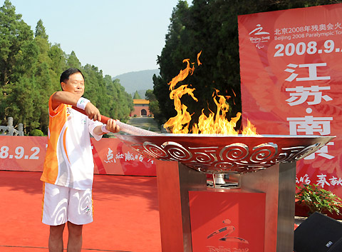 Zhou Zengfu, a field and track coach at a disabled training center in Jiangsu Province lights the cauldron, September 2, 2008. [Xinhua]
