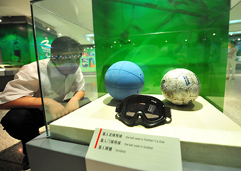 A spectator looks at various sports appliances including goggles for the visually impaired at an exhibition on the Beijing Paralympic Games in China Millennium Monument Museum, September 1, 2008. [Xinhua]
