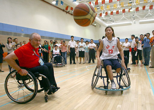 International Paralympic Committee president Philip Craven (L) takes part in a friendly basketball match with Chinese Paralympic athletes at the Olympic community in Beijing on August 30, 2008. [Agencies]