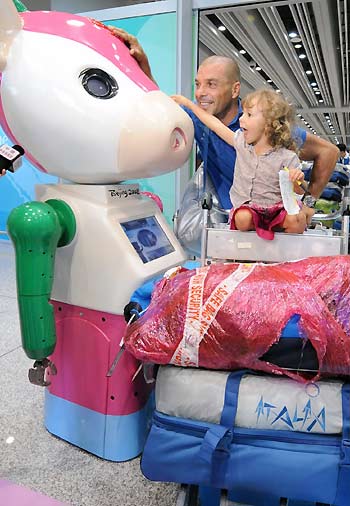 A Beijing Paralympic athlete and his daughter talk with robot Fu Niu Lele, the mascot for the Beijing Paralympics, at the Beijing airport, September 2, 2008. [Xinhua]