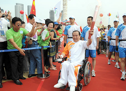 Li Yang, the chairman of Dalian Disabled Federation, holds the torch during his leg of the Olympic torch relay in Dalian on September 3, 2008.[Xinhua]