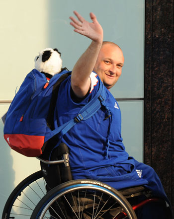 A Paralympic athlete wears a knapsack with his newly bought panda toy, waves in front of the camera as he arrives at Beijing Capital International Airport in Beijing, September 3, 2008. The Paralympic Games will kick off on Saturday. [Xinhua]