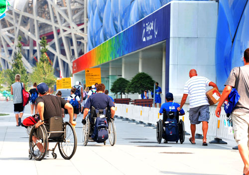 Paralympic athletes roll their wheelchairs into the National Aquatics Center, also known as the "Water Cube", for training in Beijing, September 3, 2008. The Beijing Paralympic Games will kick off on Saturday. [Xinhua]
