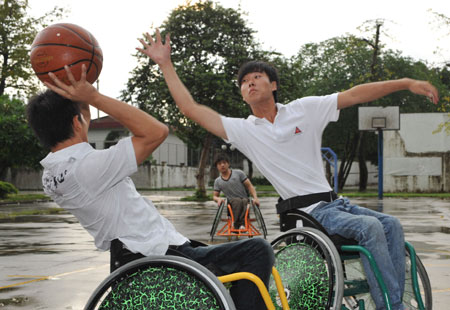 Two students on wheelchair play basketball in a technical secondary school specially for disabled students in Guangzhou of South China's Guangdong Province September 4, 2008. [Xinhua]