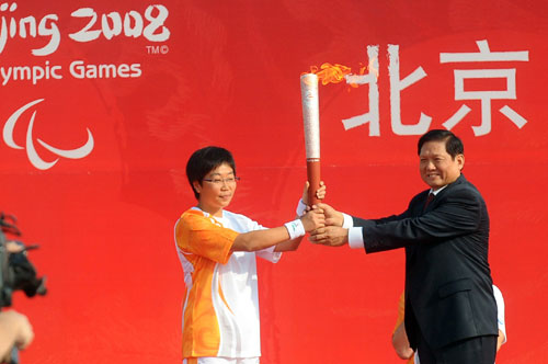 Liu Qi (R), president of the Beijing Organizing Committee for the 2008 Olympic Games, hands the torch to Paralympic athlete Wang Juan during the Beijing 2008 Paralympic torch relay in Beijing September 5, 2008.[Xinhua]