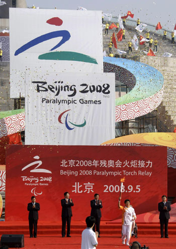 China's Paralympic athlete Wang Juan (2nd R) takes part in the Beijing 2008 Paralympic torch relay in Beijing September 5, 2008. [Agencies]
