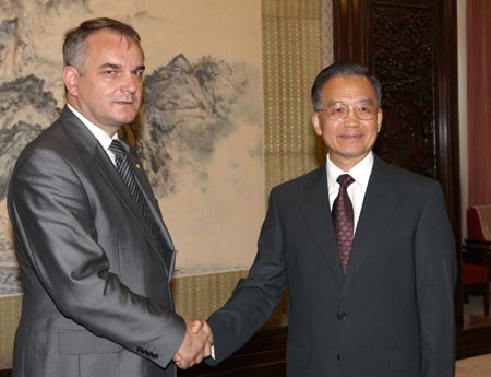 Chinese Premier Wen Jiabao (R) shakes hands with Polish Vice Prime Minister and Minister of Economy Waldemar Pawlak in Beijing, capital of China, Sep. 5, 2008. [Xinhua]