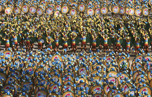 Students from the Tagou martial arts school hold logos of Fu Niu Lele, the official mascot of the Beijing 2008 Paralympic Games, as they practise at a training base on the outskirts of Beijing September 5, 2008. More than 2,000 students of the school from Henan province will perform during the opening ceremony of the Games on Saturday. [Agencies]