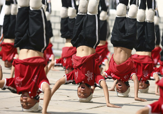 Students from the Tagou martial arts school practise at a training base on the outskirts of Beijing, September 5, 2008. More than 2,000 students from the school in Henan province will perform during the opening ceremony of the Beijing 2008 Paralympic Games on Saturday. [Agencies]