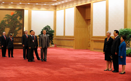 Chinese President Hu Jintao (R2) and his wife Liu Yongqing (R1) greet dignitaries and their spouses at the Great Hall of the People in Beijing on Sept. 6, 2008, ahead of a welcoming luncheon of the Beijing Paralympic Games. [Xinhua]