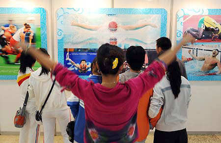 Visitors watch photos during a photo exhibition in Kunming, southwest China's Yunnan Province, Sept. 5, 2008. The five-day photo exhibition on the Beijing Olympic Games named Sharing Glory and Dream opened here Friday, displaying over 200 photos taken by photographers with Xinhua News Agency.[Xinhua]