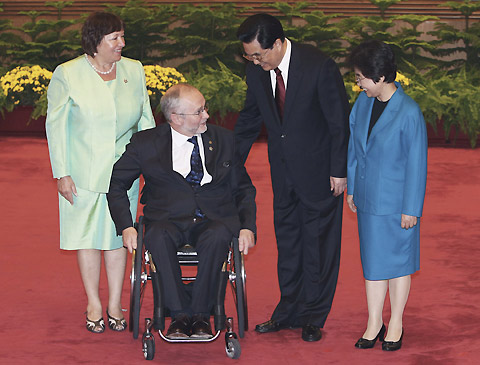 China's President Hu Jintao (2nd R) and his wife Liu Yongqing (R) greet International Paralympic Committee President Philip Craven (2nd L) and his wife at the Great Hall of the People ahead a welcoming luncheon for the opening ceremony of the Beijing Paralympic Games September 6, 2008. [Agencies]