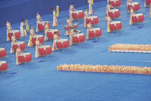 Artists perform a Chinese traditional drum show ahead of the Beijing Paralympics opening ceremony inside the National Stadium, or the "Bird's Nest", September 6, 2008. [Xinhua]