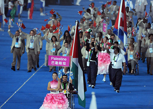 A presenter introduces the Palestinian Paralympic delegation into the National Stadium, known as the Bird's Nest, in Beijing September 6, 2008. [Xinhua]