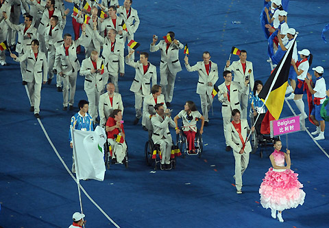 A presenter introduces the Belgian Paralympic delegation into the National Stadium , also dubbed "Bird's Nest", September 6, 2008. [Xinhua]