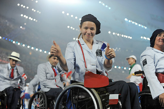 A French athlete gives a big thumb as the French Paralympic delegation parade into the National Stadium, September 6, 2008. [Xinhua]