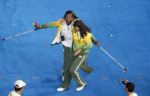 Members of the Brazilian Paralympic delegation dance as they parade into the National Stadium, also dubbed "Bird's Nest", in Beijing, September 6, 2008. The opening ceremony of the Beijing Paralympic Games began at 8 p.m. on Saturday night. [Xinhua]