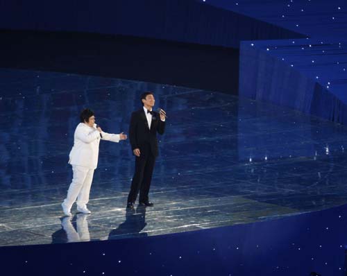 Pop signers Han Hong (L) and Andy Lau sing the theme song "Flying with the Dream" at the Paralympic opening ceremony in Beijing September 6, 2008. [Xinhua]
