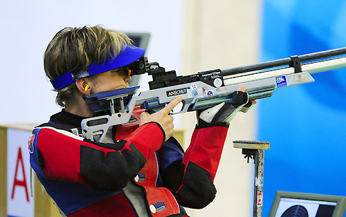 Slovakia's Veronika Vadovicova competes in the women's 10-meter air rifle standing SH1 final. Veronika Vadovicova won the Beijing Paralympics' first gold medal September 7, 2008. [Xinhua]