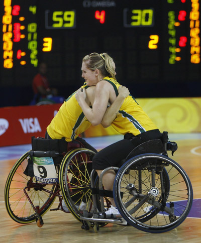 Australia's Kathleen O'Kelly-Kennedy (R) celebrates with teammate Liesl Tesch after winning their wheelchair basketball preliminaries Group A match against Britain during the Beijing 2008 Paralympic Games September 7, 2008. Australia won 59-30. [Agencies]