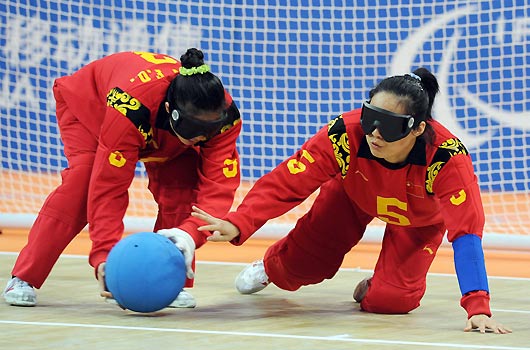 China's goalball players compete in the women's goalball preliminaries at the Beijing Paralympics, Spetember 7, 2008. [Xinhua]