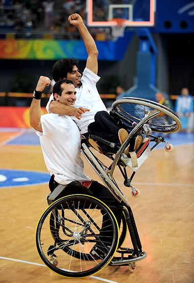 Two Iran's wheelchair basketball players celebrate after beating South Africa in the opener of the men's wheelchair basketball at the Beijing paralympics, September 7, 2008. [Xinhua]