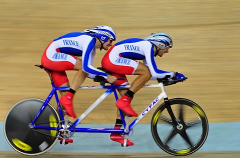 Olivier Donval (R) and John Saccomandi (L) of France compete in the men's individual pursuit (B&VI) cycling track competition during the 2008 Beijing Paralympic Games on September 7, 2008 at the Laoshan Velodrome. [Agencies]
