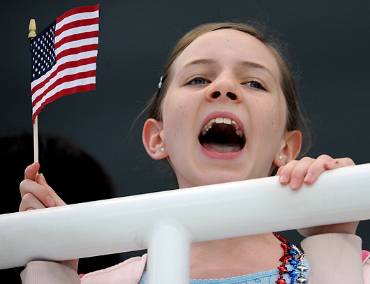 An American girl cheers for the competitors at the National Aquatics Centre, also known as the Water Cube, in Beijing September 7, 2008. [Xinhua]
