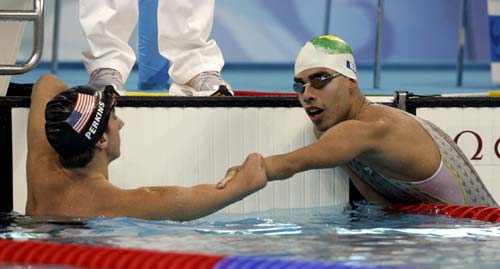 Brazil's Daniel Dias (R) congratulates Roy Perkins of the U.S. after Dias won the men's 100m freestyle S5 final at the National Aquatics Centre, also known as the Water Cube, in the Beijing 2008 Paralympic Games September 7, 2008. [Agencies]